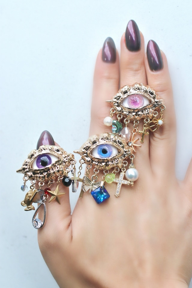 石膏とレジンで作られたドールアイを加工して指輪にしています。 フリーサイズ調節可 ※写真のものは完売しました※ 写真のものとチャームが少し違っても良ければそのままご購入ください。