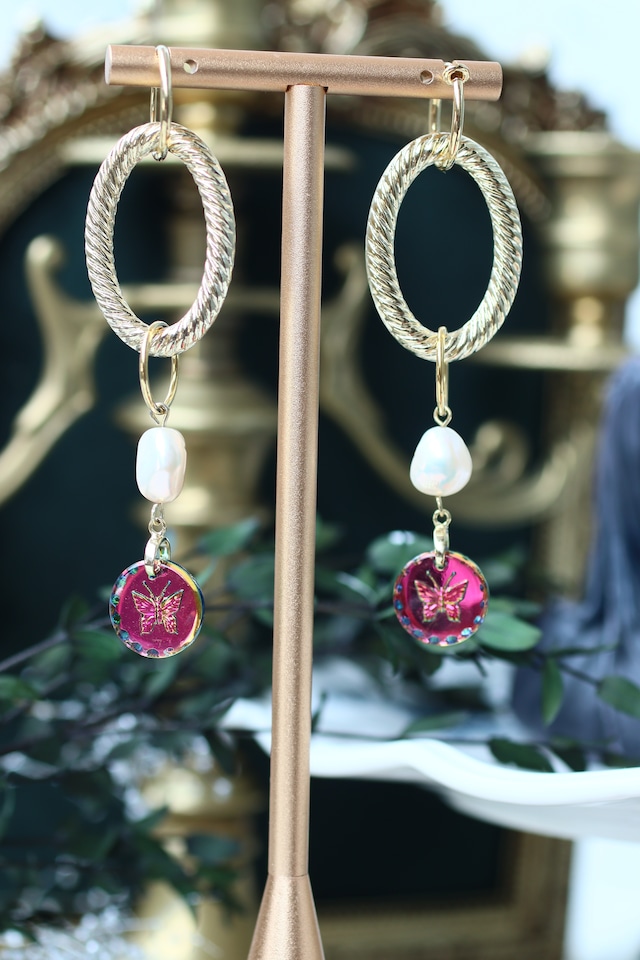 ドーム型のヴィンテージガラスやジルコニア、オーストリアガラスのそれぞれ違う輝きが水面に反射するような耳飾り