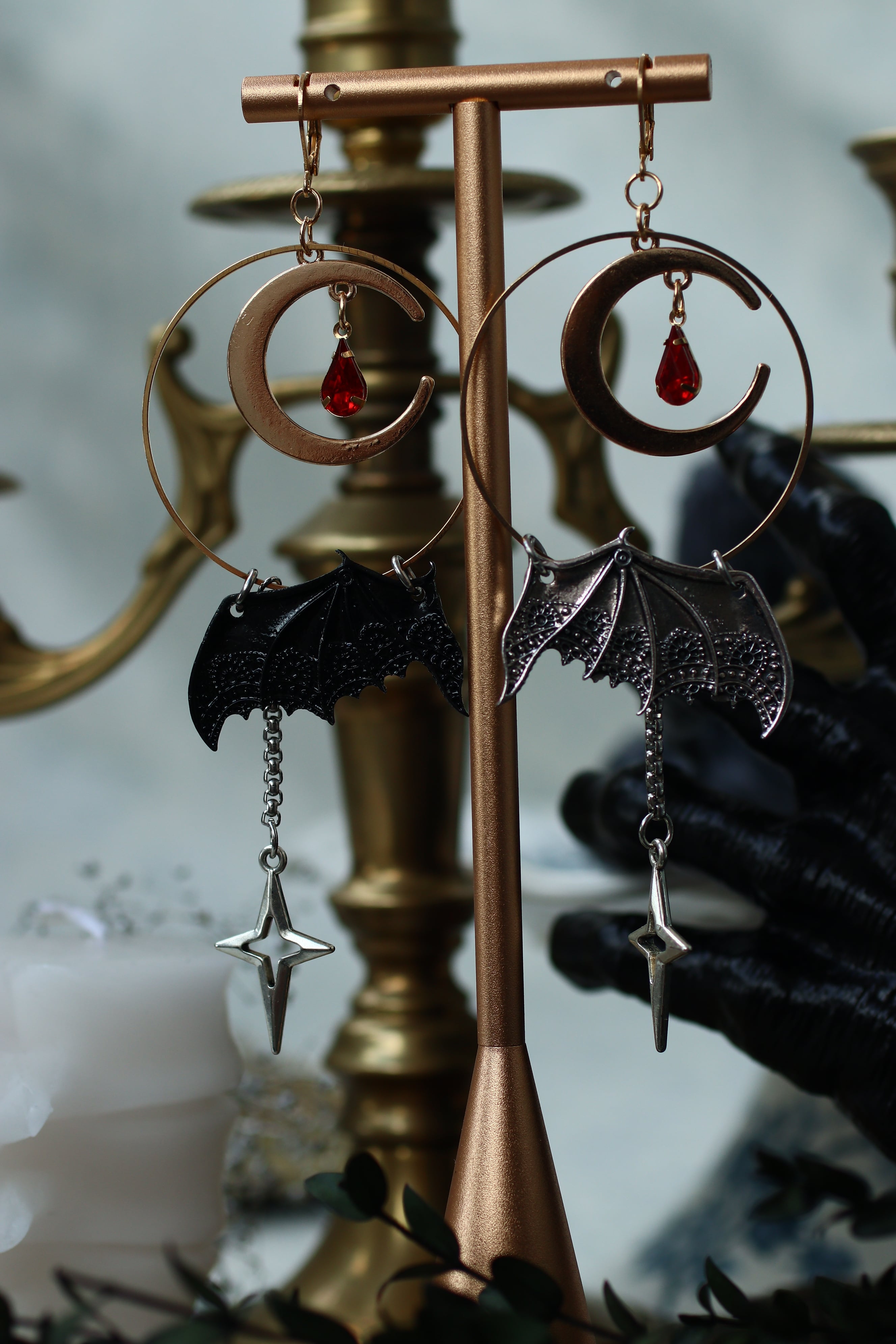 レース模様の蝙蝠の耳飾り。