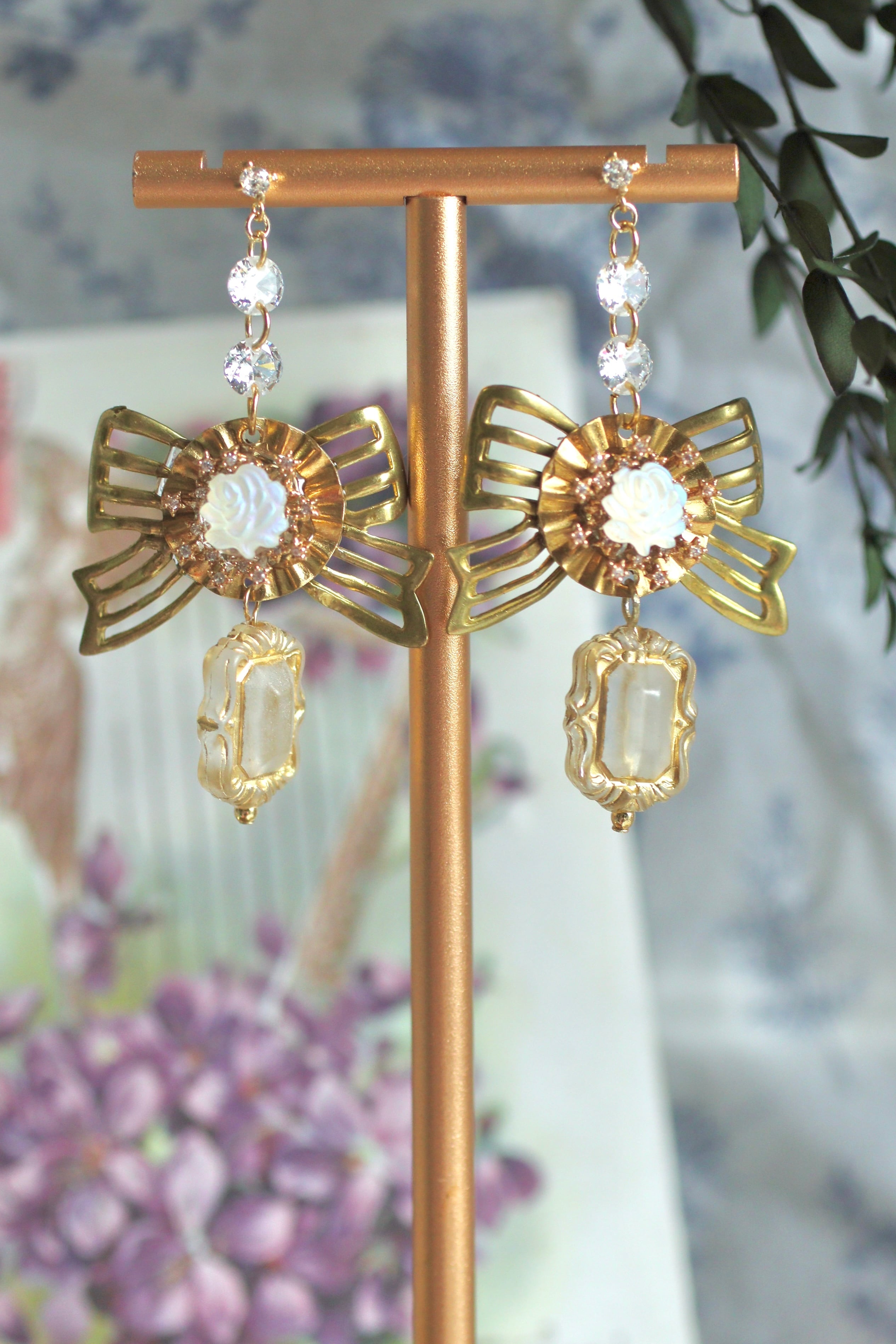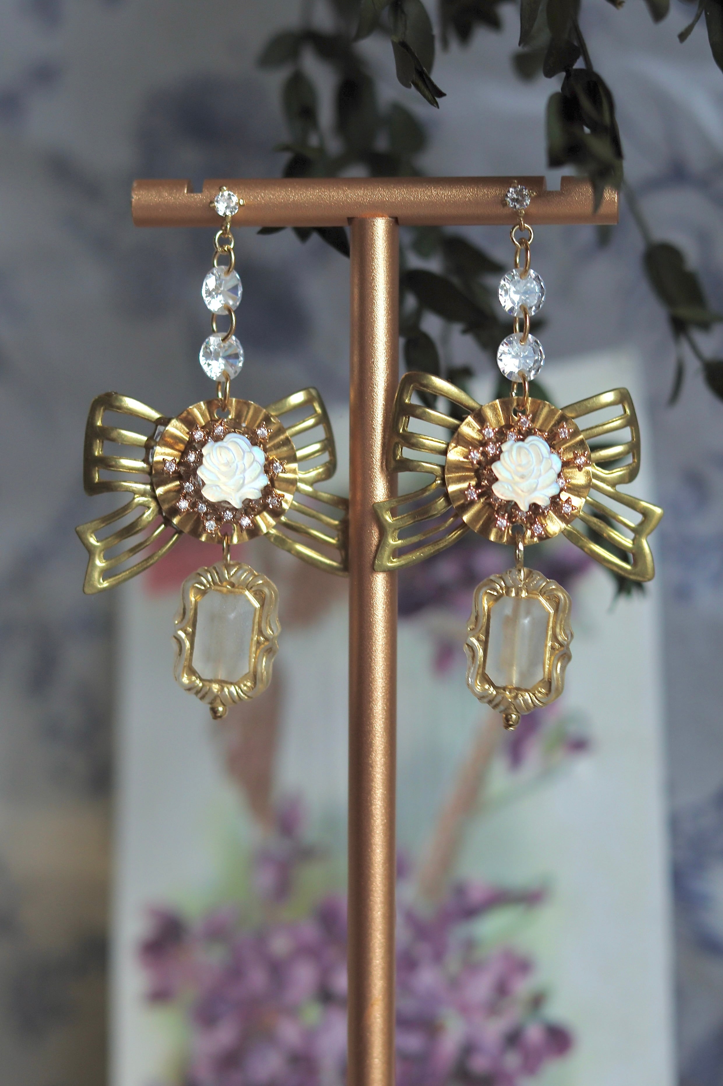 フロストの薔薇のヴィンテージガラスとリボンの耳飾り。