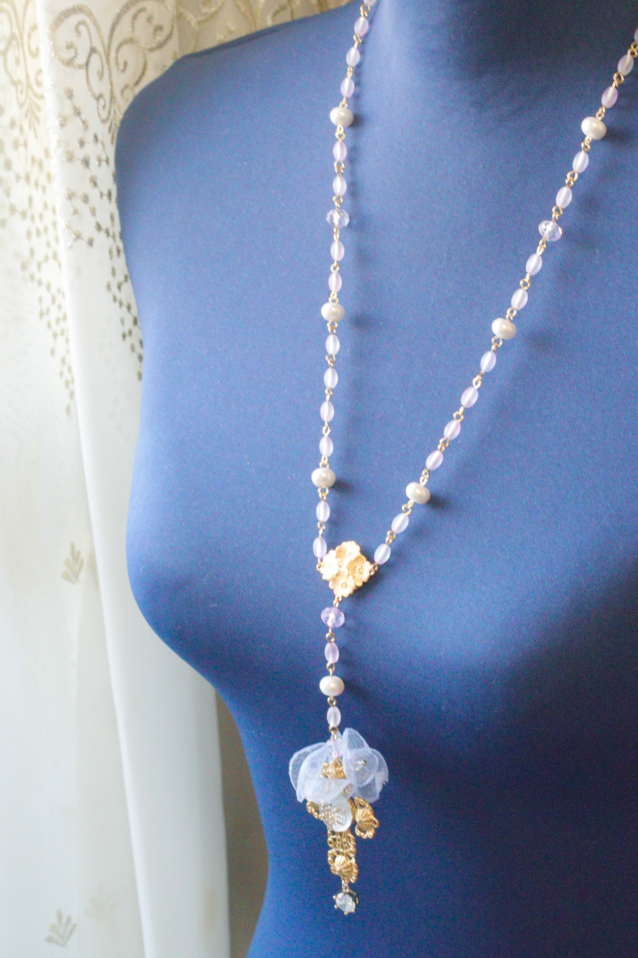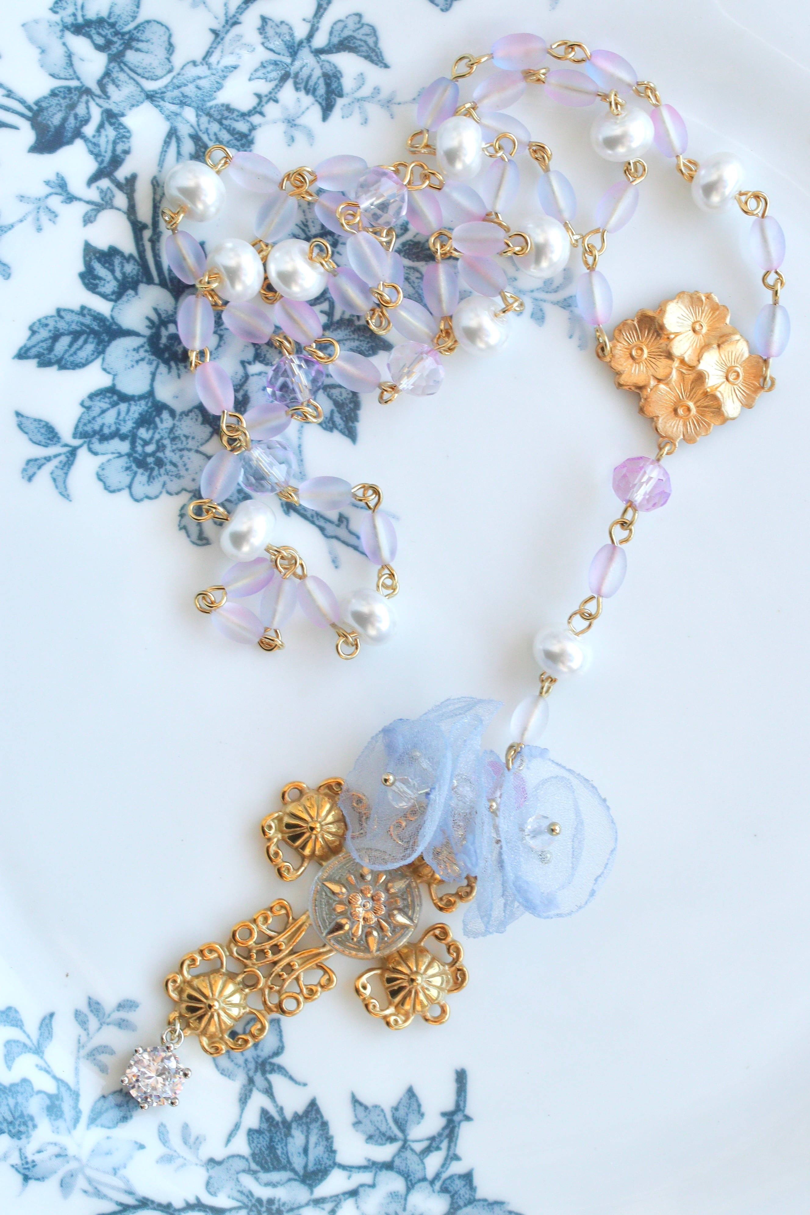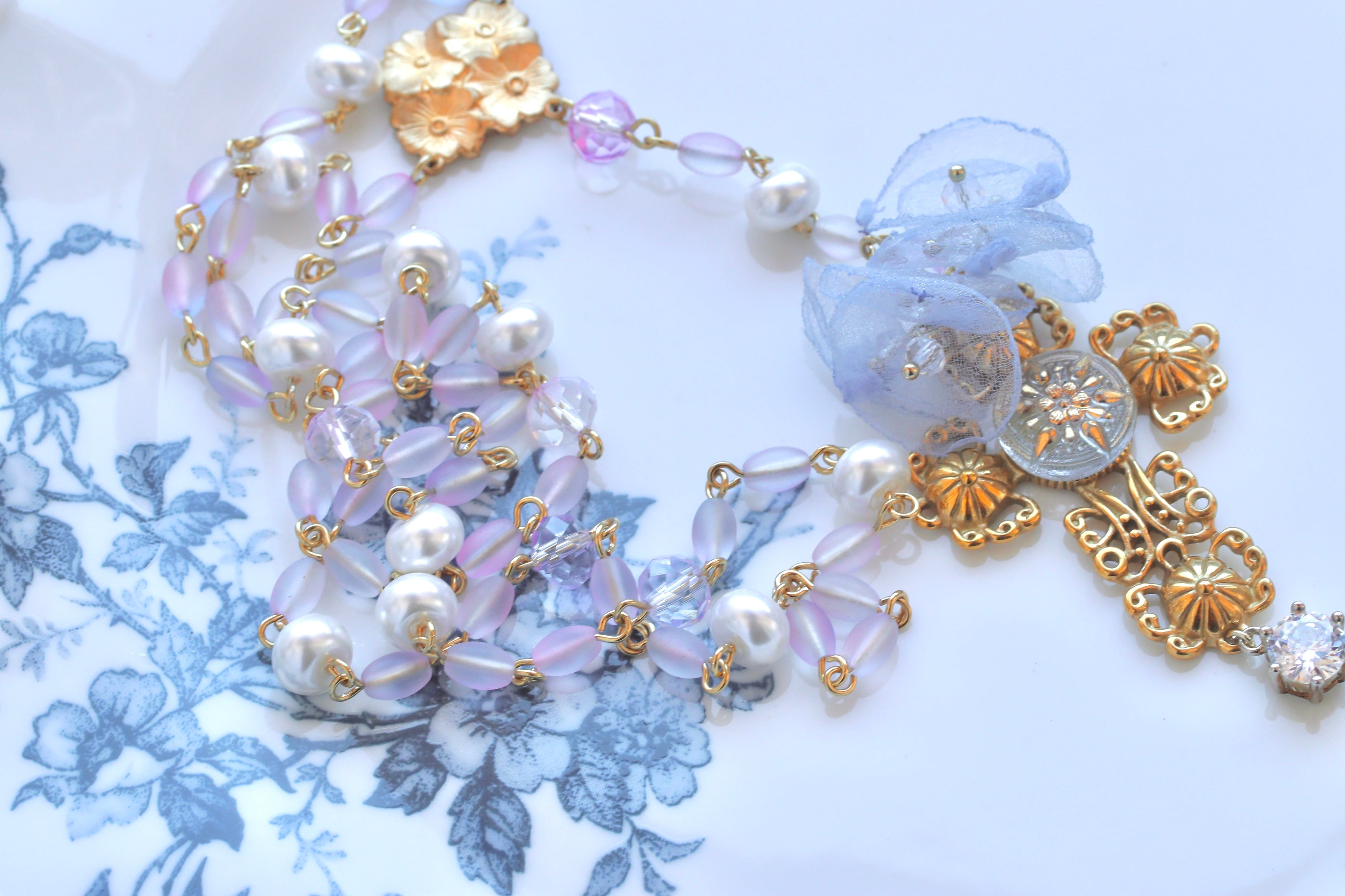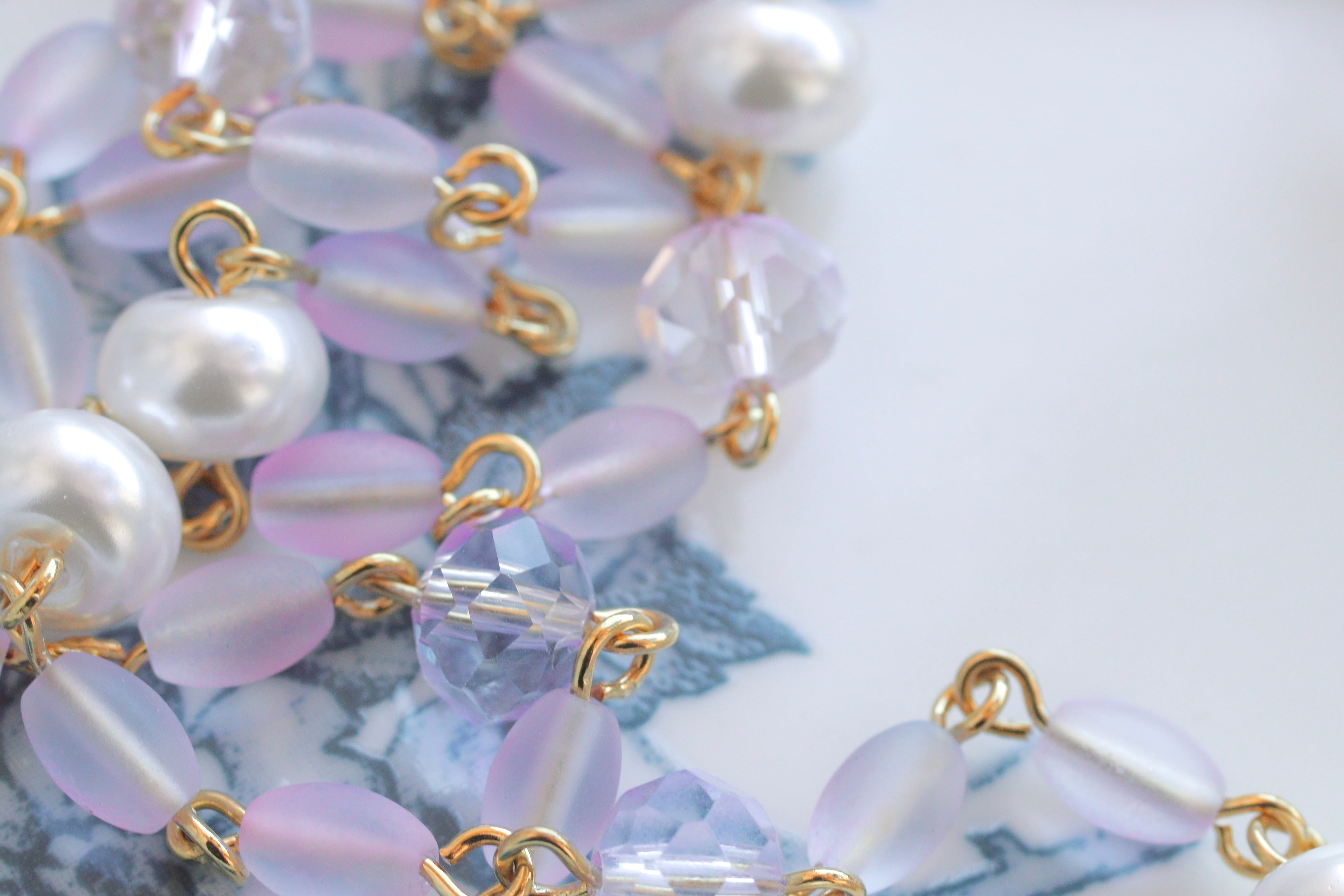 淡いピンクのガラスビーズと淡水パールのロザリオ。