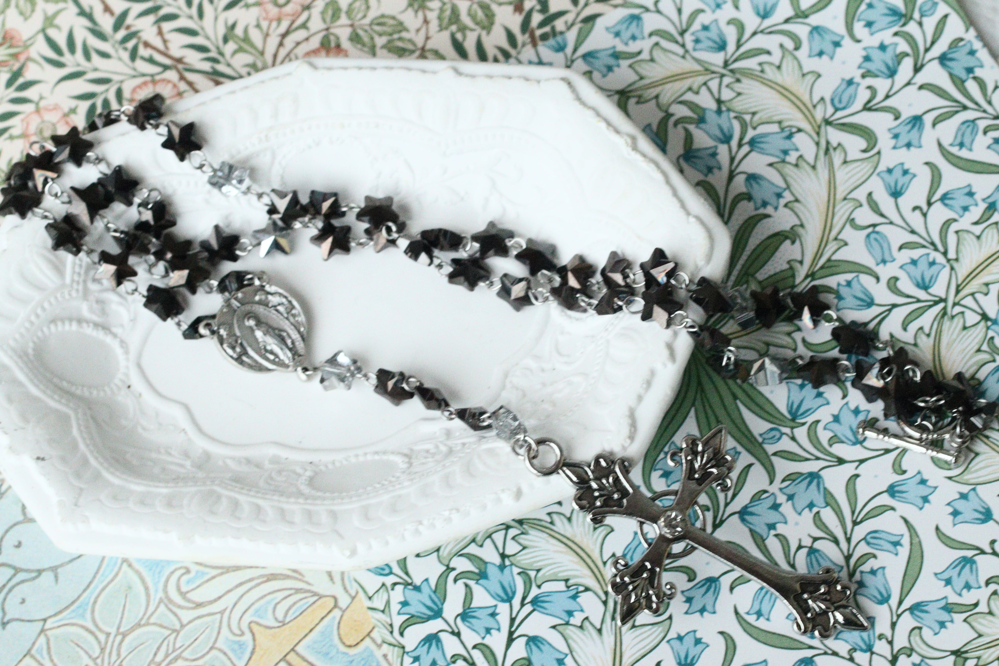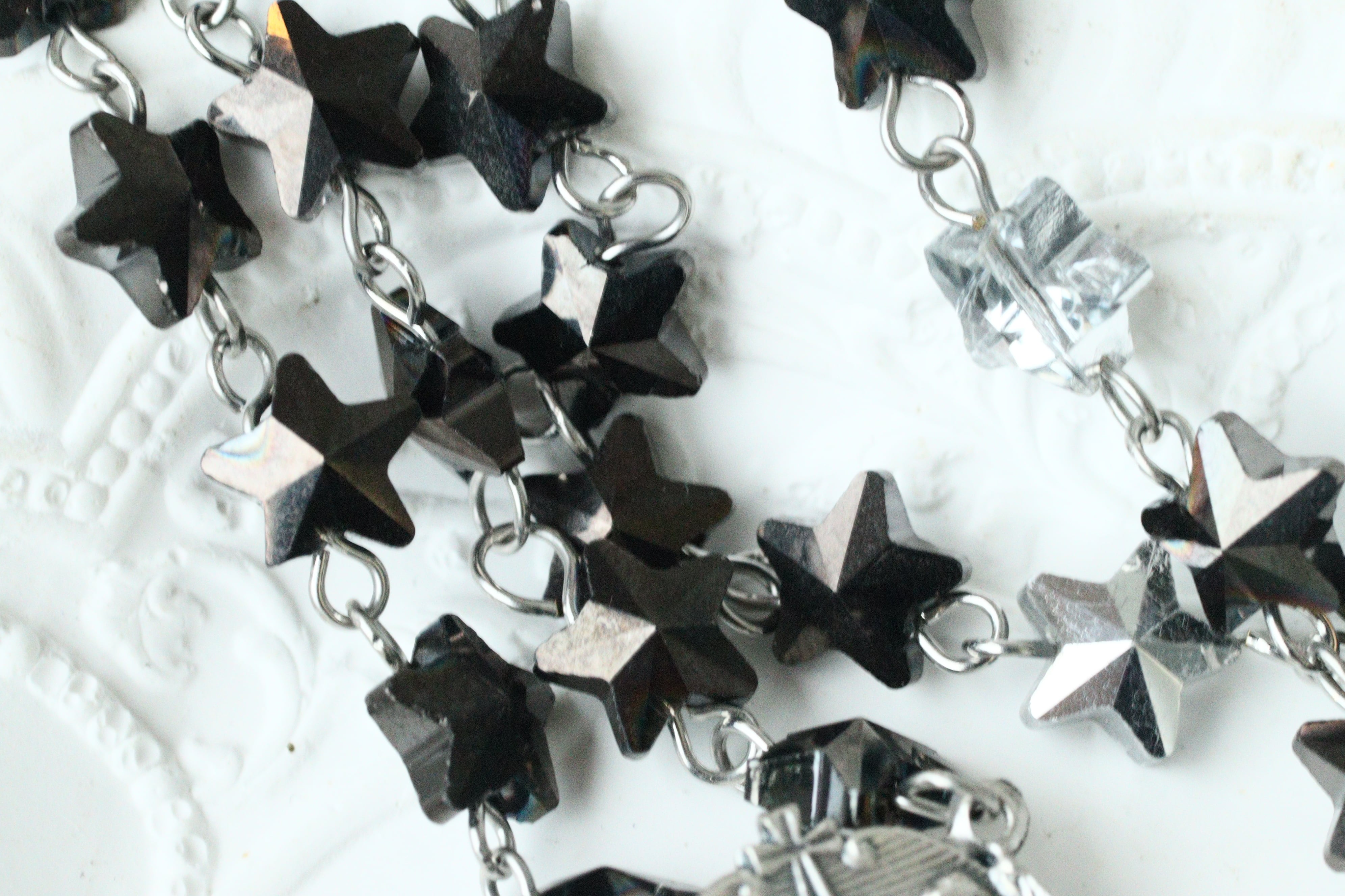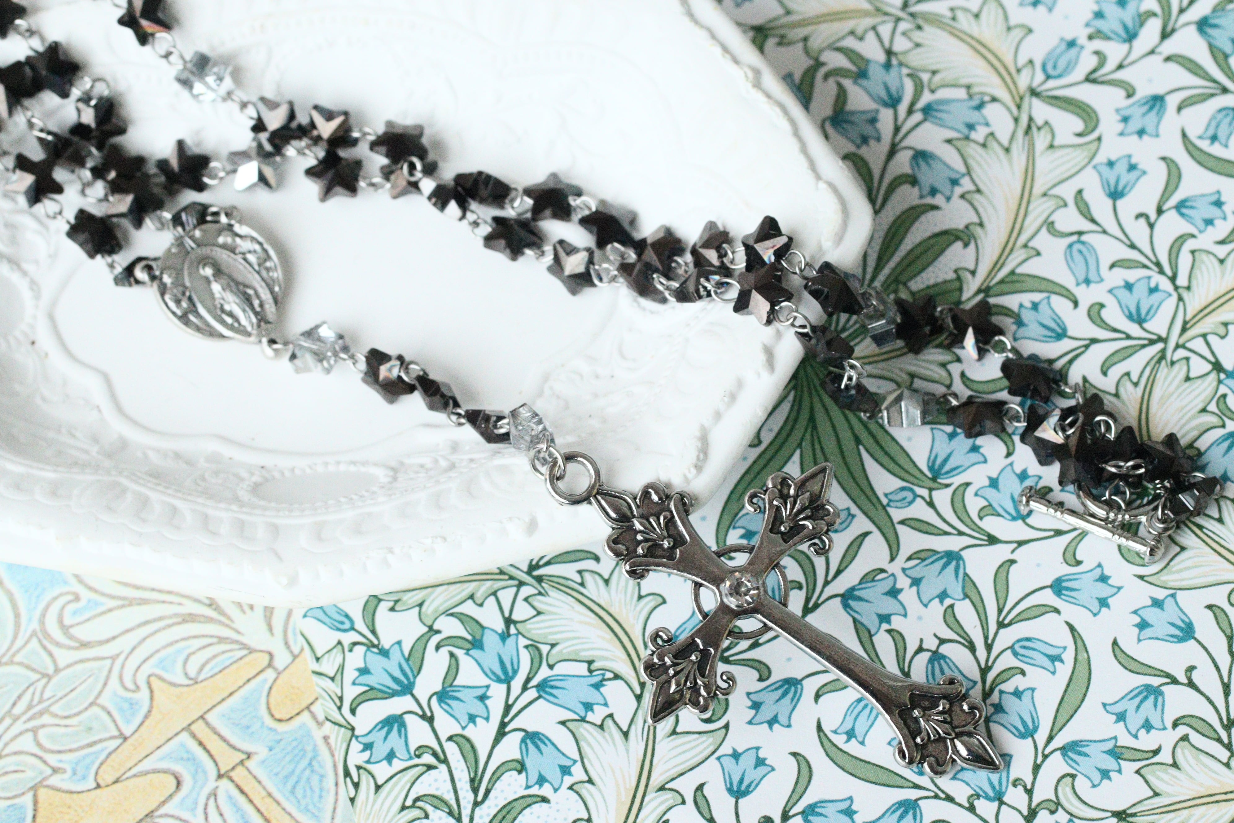 黒とシルバーの星型のガラスビーズを使ったロザリオ。 カジュアルな服にも合わせやすい雰囲気です。
