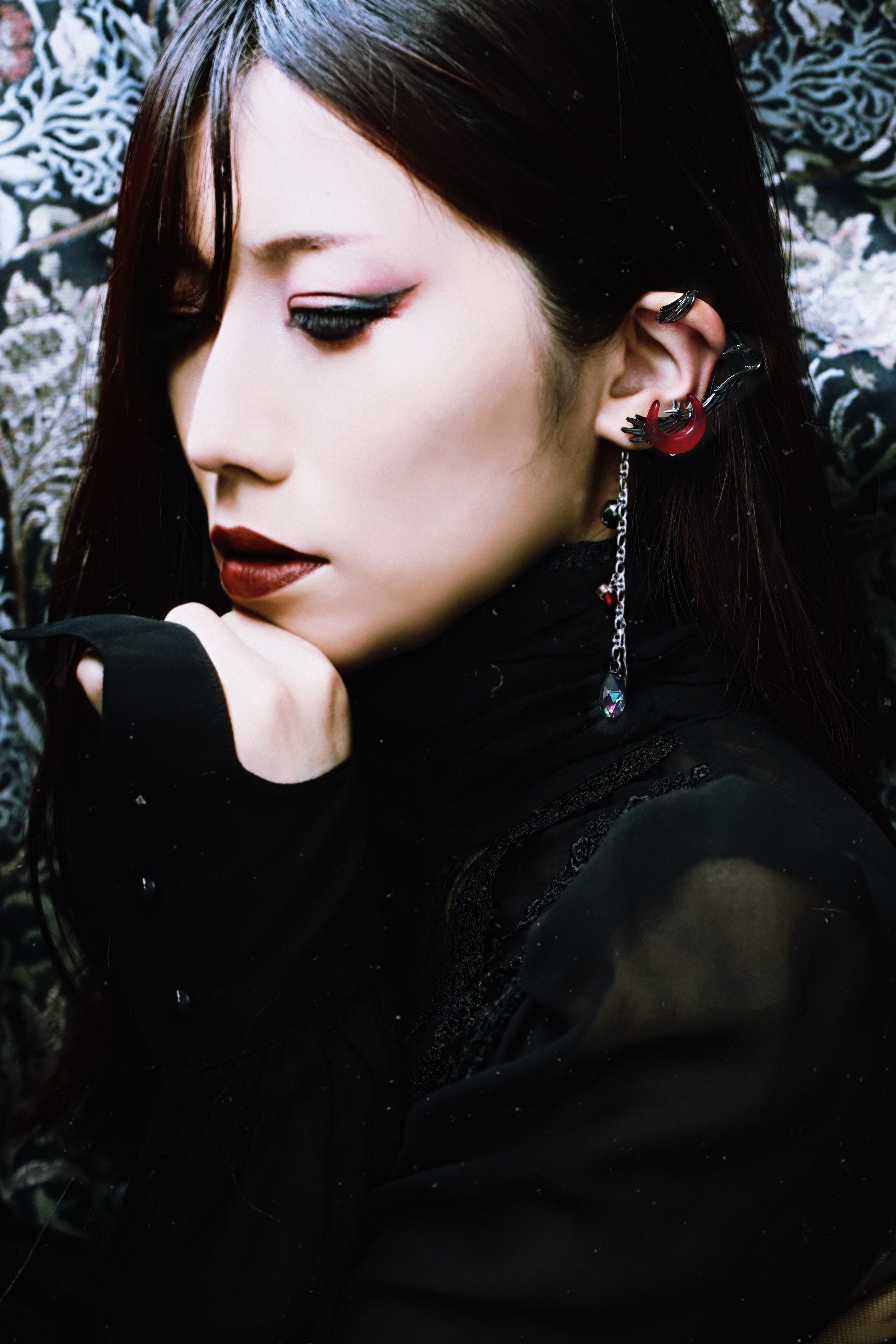 耳を包むようなカラスとアバロンシェルの棺の耳飾り。赤い月のパーツがアバロンシェルの棺に変わりました。